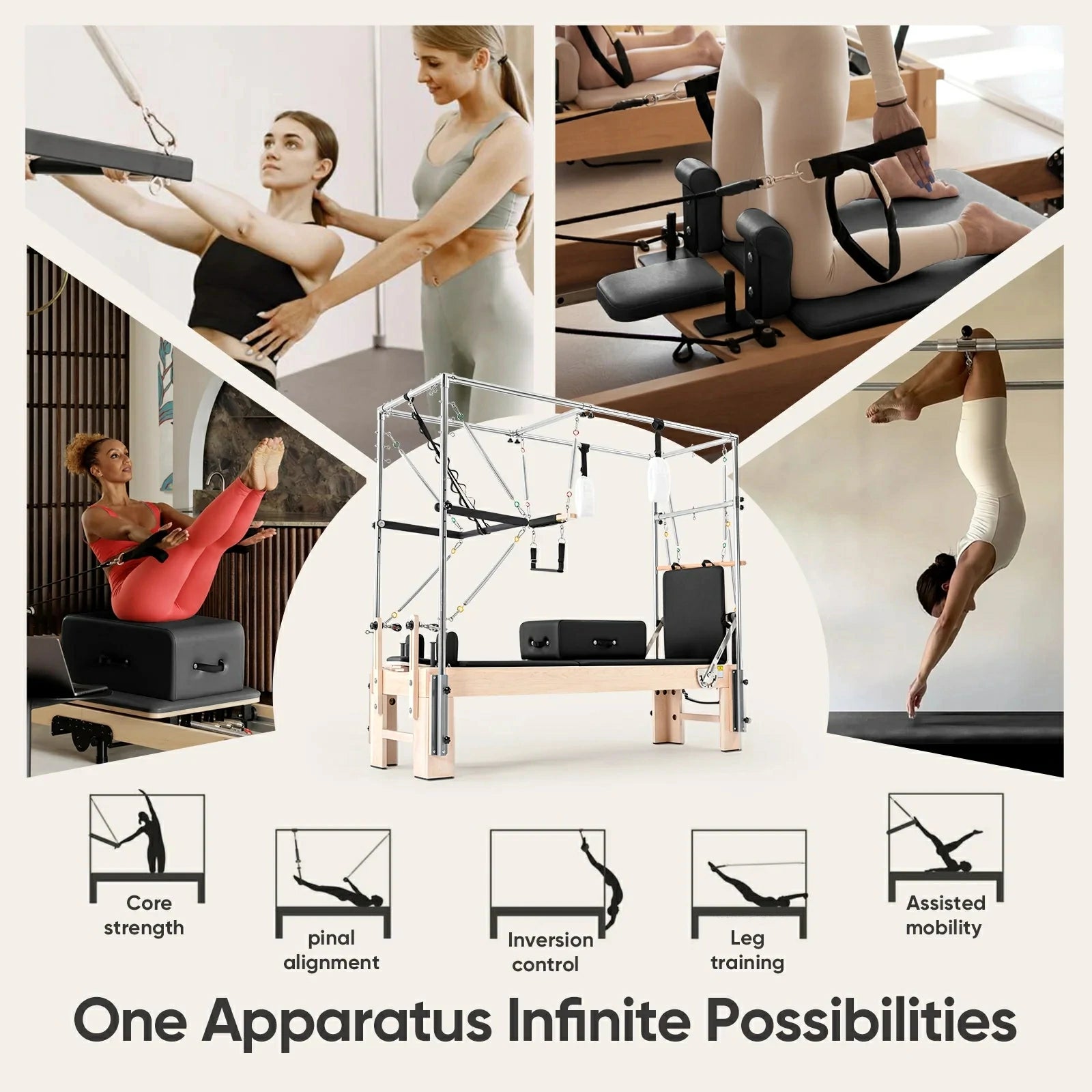 Crafted from solid North American maple, the frame delivers exceptional stability, durability, and a timeless aesthetic. A smooth-glide carriage, precision-balanced springs, and fully adjustable bars allow seamless transitions between reformer work, Cadillac exercises, and suspension-based training.
